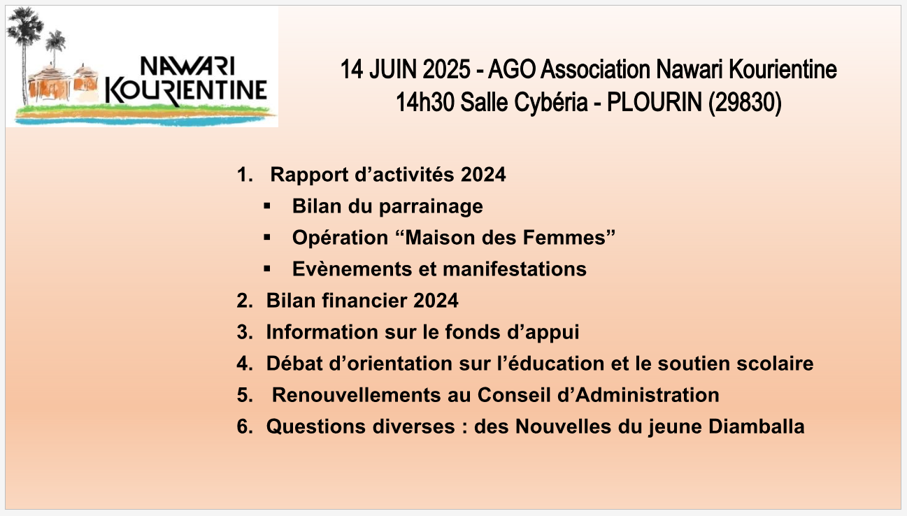 Tel qu'annoncé dans la presse, l'Assemblée Générale Ordinaire 2025 de l'association Nawari Kourientine s'est tenue à l'Amphi-Cybéria de Plourin (29830) le samedi 14 juin devant une trentaine de membres et invités, dont Monsieur Gilles Mounier, conseiller départemental du Finistère, Myriam Locquet Legall et Gaêl Amayon représentant la commune de Porspoder.